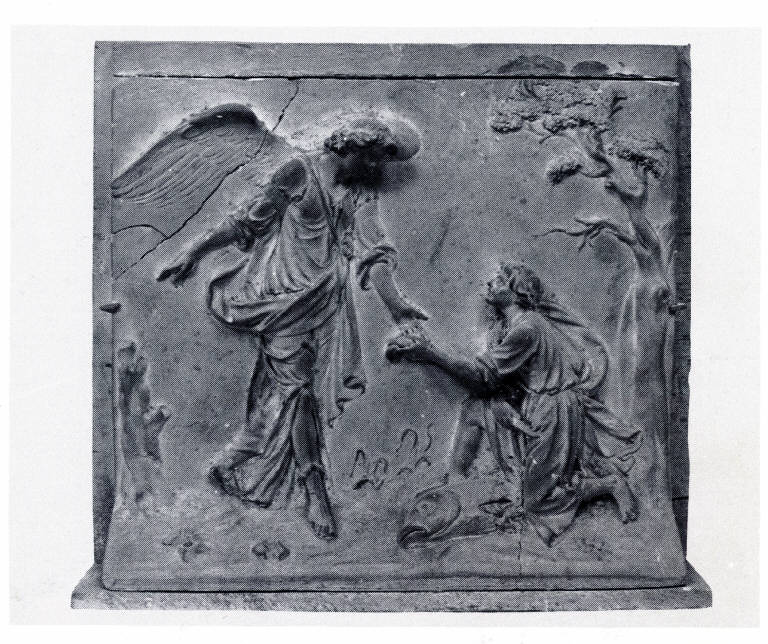 figura virile inginocchiata davanti ad un angelo, all'estrema destra, un albero.