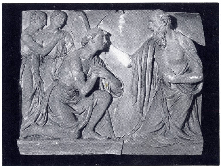 Due figure inginocchiate, una di fronte all'altra, di età differenti, due figure stanti sullo sfondo.