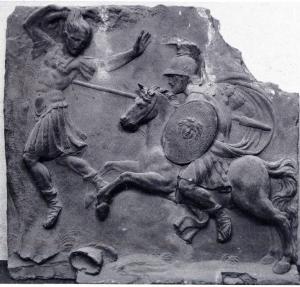 Due figure in combattimento, una prima viene trafitta dalla lancia di una unomo in armi a cavallo.