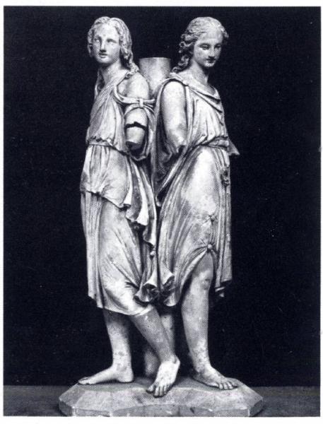 Tre angeli, schiena contro schiena, con capelli sciolti sulle spalle e vesti al ginocchio.