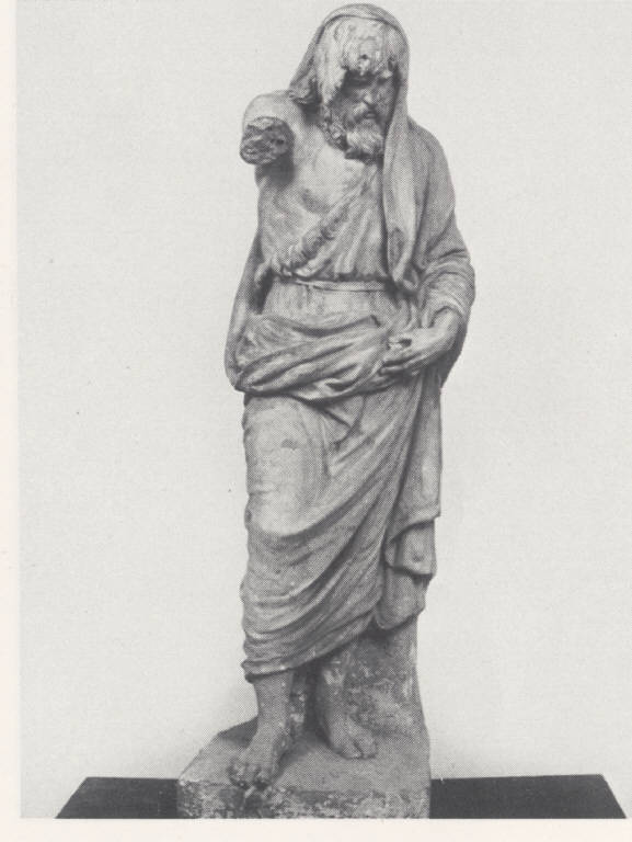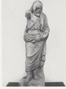 figura di vecchio, con il capo velato, chinato la mano sinistra che tratiene il pannaggio sul bacino.