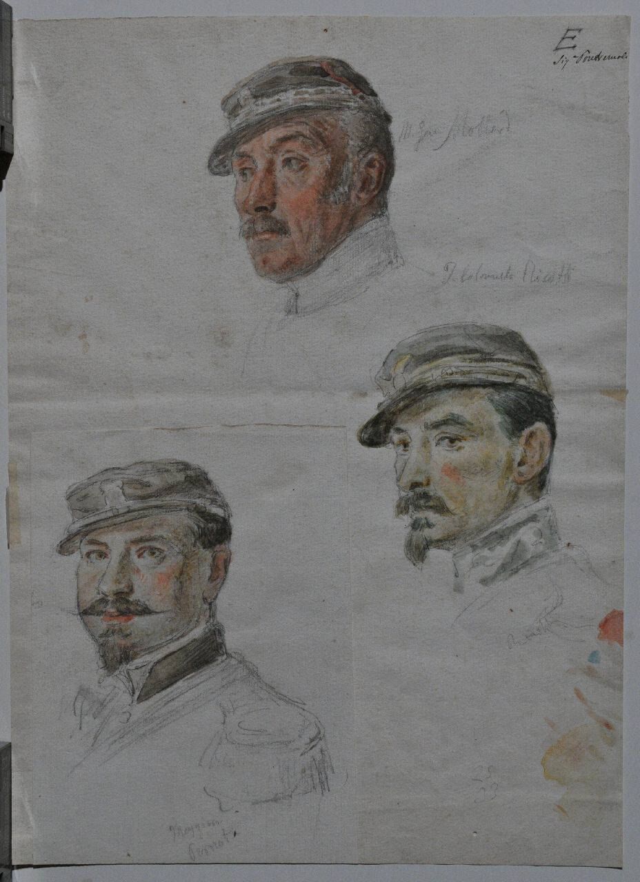Il ritratto in basso a sinistra si trova su di un foglio di dimensioni cm. 16,1 x 12,2 applicato sul foglio più grande, sul quale sono stati tracciati i ritratti degli altri due ufficiali. Il verso reca tracce di un precedente supporto secondario in cartoncino indaco.