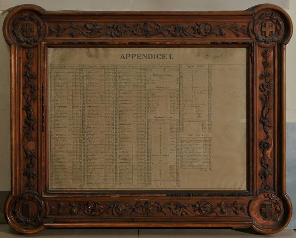 La cornice contiene documento elencante i componenti della società Solferino e San Martino - Appendice 1. Cornice molto elaborata: profilo a doppia gola, seguito da motivo a fusello alternato a perle. L'ampia fascia è decorata con tralci floreali. A segnare gli angoli, quattro medaglioni tondi contengono stemmi entro corone d'alloro. Controprofilo a foglie ricorrenti .