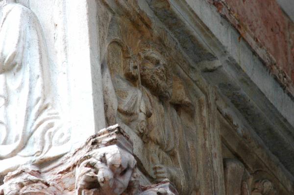 Rilievo in marmo binaco rosato di Candoglia scolpito: figura di apostolo racchiusa entro cornice quadrangolare.