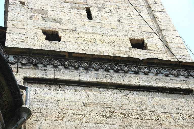 - NOTIZIE STORICO CRITICHE La costruzione del campanile ebbe inizio nel 1425, sotto la direzione dell'architetto Giovanni da Campione: i lavori, con brevi interruzioni, proseguirono fino al 1450, quando erano ormai completati i balconi della cella campanaria. L'edificio fu completato solo nel 1591, con la costruzione della cuspide in rame. Il rilievo, dal disegno prezioso ad archetti trilobi e peducci ornati di testine umane, animali e frutti, è stato probabilmente realizzato durante la prima fase del cantiere, tra il 1425 e il 1450 (cfr. Angelini, 1968, p. 40; Buonincontri, 2005, p. 133 e p. 225).