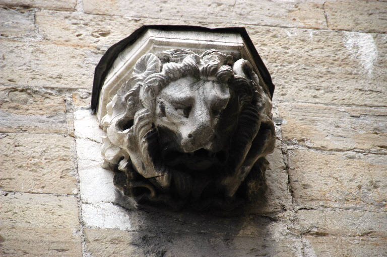 - NOTIZIE STORICO CRITICHE La costruzione del campanile ebbe inizio nel 1425, sotto la direzione dell'architetto Giovanni da Campione: i lavori, con brevi interruzioni, proseguirono fino al 1450, quando erano ormai completati i balconi della cella campanaria. L'edificio fu completato solo nel 1591, con la costruzione della cuspide in rame. La bella mensola con testa di leone, dal modellato morbido e ricco, come l'altra, assai simile, ma con una testa di ariete, collocata a poca distanza, è stata probabilmente realizzata durante la prima fase del cantiere, tra il 1425 e il 1450 (cfr. Angelini, 1968, p. 40; Buonincontri, 2005, p. 133 e p. 225).