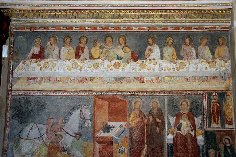 - NOTIZIE STORICO CRITICHE L'affresco fu scoperto nel 1944, durante la campagna di restauri che interessò l'intera parete di fondo del braccio sinistro del transetto: in quella occasione, Arturo Cividini riportò alla luce tutti i dipinti murali che erano stati scialbati al tempo della riforma della Basilica progettata da Pellegrino Tibaldi (Angelini, 1953, p. 48). Roberta Pellati, di recente, ha proposto di assegnare l'opera al "Maestro dell'Albero della Vita" che, secondo la studiosa, è autore della maggior parte degli affreschi della parete (Pellati, in "I pittori bergamaschi...Le origini", 1992, p. 186); già Stella Matalon (1963, p. 399) aveva rilevato, nell'anonimo autore dell'"Ultima Cena", una sensibilità affine a quella del maestro che nel 1347 dipinse il grande "Albero della Vita" nel transetto destro, per "l'accento patetico marcato da un disegno nervosamente gotico", senza spingersi però ad affermare una identità di mano; e in effetti la minore qualità del pittore dell'"Ultima Cena", evidente soprattutto nella resa approssimativa dei particolari anatomici, sembra dare ragione alla cautela della Matalon.