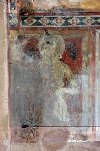 - NOTIZIE STORICO CRITICHE L'affresco fu scoperto nel 1944, durante la campagna di restauri che interessò l'intera parete di fondo del braccio sinistro del transetto: in quella occasione, Arturo Cividini riportò alla luce tutti i dipinti murali che erano stati scialbati al tempo della riforma della Basilica progettata da Pellegrino Tibaldi (Angelini, 1953, p. 48). Roberta Pellati, di recente, ha proposto di assegnare l'opera al "Maestro delll'Albero della Vita" (Pellati, in "I pittori bergamaschi...Le origini", 1992, p. 186); ma le condizioni di conservazione dell'affresco , ormai quasi completamente perduto, non consentono a mio avviso, un giudizio sicuro.