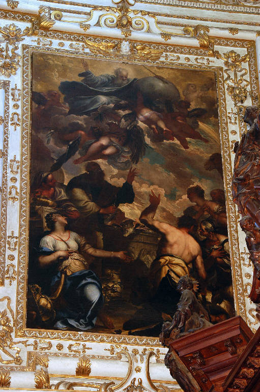 - NOTIZIE STORICO CRITICHE Il dipinto, eseguito da Federico Cervelli nel 1678, narra il celebre episodio biblico del "Sacrificio di Noè" (Genesi, 8,20-22; 9,1-17): al termine del Diluvio Noè, uscito dall'arca insieme agli otto sopravvissuti e agli animali, erige un altare e celebra un sacrificio con animali e volatili puri, in segno di ringraziamento a Dio.\nNel 1677 la Congregazione della Misericordia Maggiore decise di bandire un concorso: il vincitore avrebbe dovuto realizzare il quadro che Ciro Ferri, dieci anni prima, seccato per le critiche ricevute, aveva ritirato, rompendo definitivamente i rapporti con la committenza bergamasca: il tema era, appunto, il "Sacrificio di Noè". Alla gara parteciparono Pietro Negri, Federico Cervelli e il "cav. Perugini di Torino": i deputati della MIA, con undici voti a favore, scelsero il bozzetto presentato da Cervelli, che ricevette l'incarico e consegnò il dipinto nel 1678. I deputati, però, non furono totalmente soddisfatti della prova del pittore veneziano: nel documento di saldo al pittore, versato il 13 gennaio 1679, si accenna infatti agli "aggiustamenti" richiesti all'artista, e finalmente compiuti (Olivari, in "I pittori bergamaschi...Il Seicento", vol. IV, p. 234, scheda 9).\nL'opera è stata restaurata nel 1960 da Franco Steffanoni (cfr. "Relazione sui lavori di restauro eseguiti ai dipinti della Basilica di Santa Maria Maggiore per incarico dell'E.C.A. di Bergamo", 24 maggio 1961, protoc. 1232, cat. 5, clas. 6, fasc. 17, Archivio Congregazione Misericordia Maggiore, Bergamo).