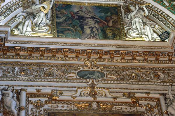 - NOTIZIE STORICO CRITICHE Il cartiglio, come l'intera decorazione a stucco del transetto sinistro, fu eseguito tra il 1659 e il 1665 da Giovanni Angelo Sala, in collaborazione con il figlio Gerolamo (Rampinelli, 2001; Spiriti, 2009).; probabilmente anche il piccolo affresco, di cui non si trova alcuna menzione nella letteratura critica, fu realizzato all'interno della bottega, ad opera di un decoratore specializzato.