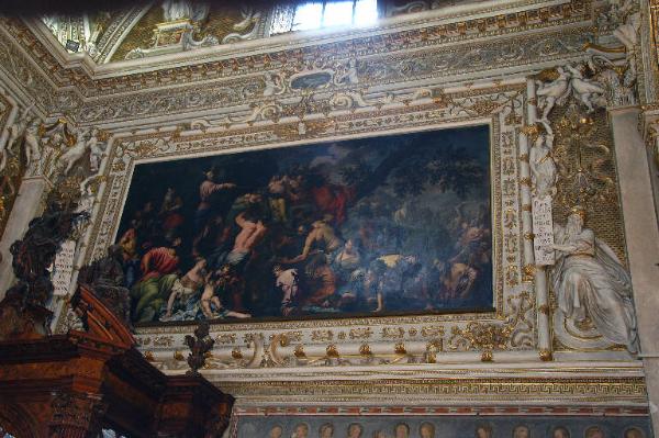Decorazione plastica posta a cornice del "Mosè fa scaturire l'acqua dalla roccia" di Antonio Zanchi: cornice a profilo spezzato in stucco bianco sottilmente profilato in oro, ornata da motivi decorativi vegetali, a nastro e, al centro del lato superiore, da una testina angelica; in basso, a destra e a sinistra, due figure di profeti; verso l'alto, a destra e a sinistra, due cariatidi in forma d'angelo; in alto, a destra e a sinistra, due coppie di angioletti.