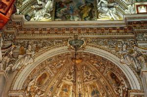 Decorazione dell'arco di accesso alla Cappella del Voto: a destra e a sinistra, due grandi figure di angeli; al centro, cartiglio in stucco a volute che racchiude una piccola figura virile seduta, vista di spalle, dpinta a monocromo.