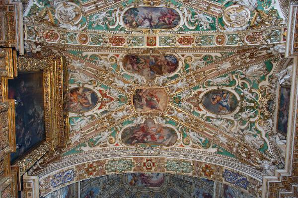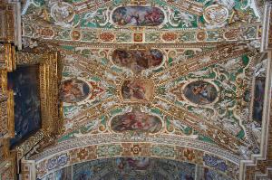 Decorazione pittorica della volta della prima campata: scene a fresco entro cornici mistilinee e ovali.