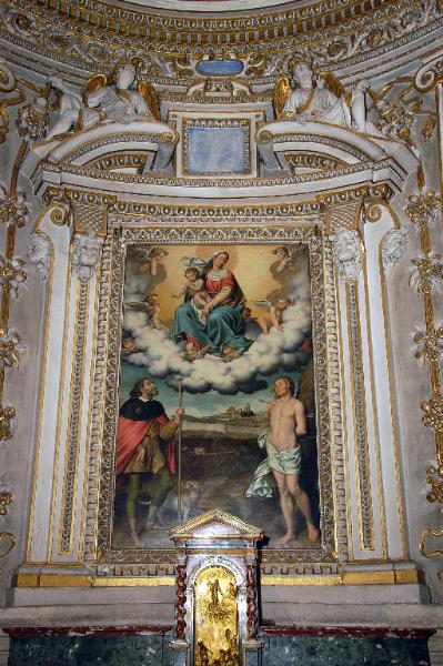 - NOTIZIE STORICO CRITICHE L'ancona fu realizzata da Francesco e Lorenzo Porta, stuccatori originari di Osteno, sul lago di Lugano, tra il 1582, anno in cui la loro presenza è attestata per la prima volta in basilica, e il 1584, che è la data del primo acconto ricevuto da Giovan Paolo Lolmo per l'esecuzione della pala d'altare; i Porta seguirono, con ogni probabilità, le indicazioni, e forse i disegni, del grande decoratore milanese Francesco Brembilla che, con l'architetto del Duomo Martino Bassi, lavorò a partire dal 1581 alla costruzione della cappella (Cortesi Bosco, in "I pittori bergamaschi...Il Seicento", vol. II, pp. 92-94, nota 5).