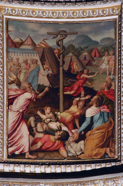 - NOTIZIE STORICO CRITICHE Il dipinto, eseguito da Giovan Paolo Lolmo tra il 1584 e il 1587, narra il celebre episodio biblico del "Serpente di bronzo" (Numeri 21, 4-9): durante il lungo cammino nel deserto, il popolo ebraico, stanco e sofferente per le privazioni, si rivolta contro Mosè e la volontà divina; Dio manda nell'accampamento serpenti velenosi, che portano paura e morte; gli israeliti si pentono e Mosè, per ordine divino, fonde un serpente di bronzo e lo fissa a un palo; chiunque fosse stato morso dai serpenti, fissando il simulacro avrebbe avuta salva la vita.\nNel 1581 il Consiglio cittadino di Bergamo decise di costruire in Santa Maria Maggiore la cappella dedicata alla Vergine e ai santi Rocco e Sebastiano, per sciogliere il voto di rigraziamento pronunciato nel 1578, al termine della violenta epidemia di peste cominciata nel 1576; furono chiamati a compiere l'opera l'architetto del Duomo di Milano, e il suo collaboratore più fedele, il decoratore Francesco Brembilla; gli stucchi furono affidati a Francesco e Lorenzo Porta. Per la pala d'altare, si pensò al pittore bergamasco Giovan Paolo Lolmo, che il 20 novembre 1584 ricevette il primo acconto "per l'ancona nella cappella del voto della città" e nel 1587 il saldo definitivo, che comprendeva anche il secondo dipinto eseguito dall'artista nella cappella, il "Serpente di bronzo" (Ciardi Dupré, in "I pittori bergamaschi...Il Cinquecento", vol. IV, p. 17 e p. 31, scheda 7).\nL'opera è stata restaurata nel 1960 da Franco Steffanoni (cfr. "Relazione sui lavori di restauro eseguiti ai dipinti della Basilica di Santa Maria Maggiore per incarico dell'E.C.A. di Bergamo", 24 maggio 1961, protoc. 1232, cat. 5, clas. 6, fasc. 17, Archivio Congregazione Misericordia Maggiore, Bergamo).