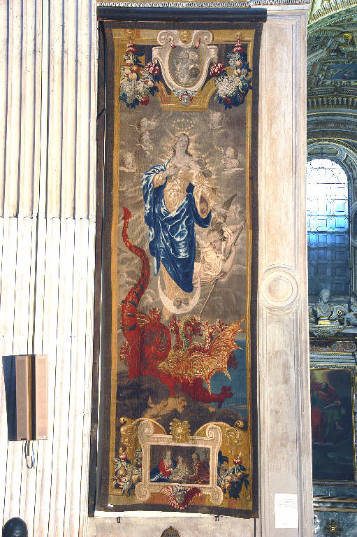 - NOTIZIE STORICO CRITICHE L'arazzo appartiene alla serie detta convenzionalmente "di Anversa", composta dall'"Immacolata", dal "Mosè al roveto ardente" (identico a questo per dimensioni) e dalla grande "Crocifissione" (attualmente in restauro). La storia della serie è stata ricostruita con precisione dal Meli (1962, pp. 38-62): nel 1696 i deputati della Misercordia Maggiore decisero, un secolo dopo la conclusione dell'impresa degli arazzi fiorentini, di ordinare tre nuove opere destinate ad ornare le pareti della basilica; per il tramite di due uomini d'affari bergamaschi, Giovanni Antonio d'Andrea e Giovanni Andrea Asperti, presero contatto con le celebri manifatture di Anversa, e avviarono le trattative con il pittore Ludwig van Schoor, per l'esecuzione dei cartoni, e con il tessitore Joannes Reghelbrugghe. Nell'ottobre dello stesso anno giunsero a Bergamo i modelli dei due arazzi minori (l'"Immacolata" e il "Mosè"); nel frattempo, in setembre, era stato mandato ad Anversa il disegno dei fregi, che il pittore bergamasco Alvise Cima aveva copiato dagi arazzi fiorentini, e che van Schoor avrebbe dovuto riprodurre identici, per ragioni di uniformità. Nel luglio del 1698 la serie era terminata: gli arazzi furono spediti a Bergamo, e il 4 settembre dello stesso anno furono saldati i conti con il pittore fiammingo e l'arazziere. Esposti in chiesa prima del 13 dicembre 1698, quando il ministro della MIA Giulio Antonio Alessandri ne fa menzione in una lettera indirizzata al nunzio del Duca di Parma a Parigi, suscitarono grande meraviglia per la perfezione del disegno e dell'esecuzione.\nL'opera ha subito un complesso intervento di restauro nel 1998 (Centro Restauro Manufatti Tessili di Francesco Pertegato, Milano; cfr. relazione tecnica in data 7 ottobre 1998, prot. 3673, cat. 5, clas. 6, fasc. 16, Archivio Congregazione della Misericordia Maggiore, Bergamo).