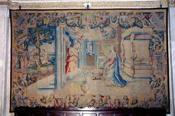 - NOTIZIE STORICO CRITICHE L'arazzo, che raffigura nell'episodio principale la scena dell'"Annunciazione" e, a sinistra, sullo sfondo il tema del "Peccato originale", appartiene alla serie convenzionalmente detta "fiorentina", realizzata nelle Manifatture Medicee, per incarico della MIA, tra il 1583 e il 1586 e interamente dedicata alla vita della Vergine..\nNel 1580 i deputati della Misericordia Maggiore decisero infatti di provvedere la Basilica di arazzi destinati ad ornare l'edificio nelle occasioni solenni, risparmiando così le cifre ingenti che si spendevano per gli apparati effimeri: per il tramite di Girolamo Biffi, uomo d'affari bergamasco d'origine ma da anni residente a Firenze, si presero dunque contatti con il Granduca di Toscana, per ottenere i permessi necessari, e con l'Arazzeria Medicea per l'esecuzione; i cartoni furono affidati ad Alessandro Allori e alla sua bottega, la tessitura a Benedetto Squilli di Michele (Meli, 1962, pp. 24-37). Gli arazzi giunsero a Bergamo in tre consegne successive: nel 1583 la "Natività", l'"Adorazione dei Magi" e la "Fuga in Egitto", tra il 1584 e il 1585 l'"Annunciazione", lo "Sposalizio della Vergine", la "Visitazione", la "Circoncisione" e l'"Assunzione della Vergine"; infine, nel 1586, la "Presentazione della Vergine al tempio" (Meli, cit.). \nL'opera ha subito un complesso intervento di restauro tra il 2000 e il 2003, curato da Annamaria Morassutti (cfr. pratica n. 526, cart. 94, Archivio Congregazione Misericordia Maggiore, Bergamo).