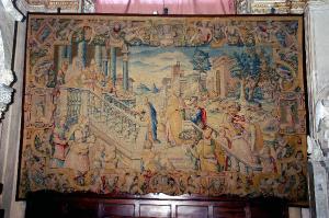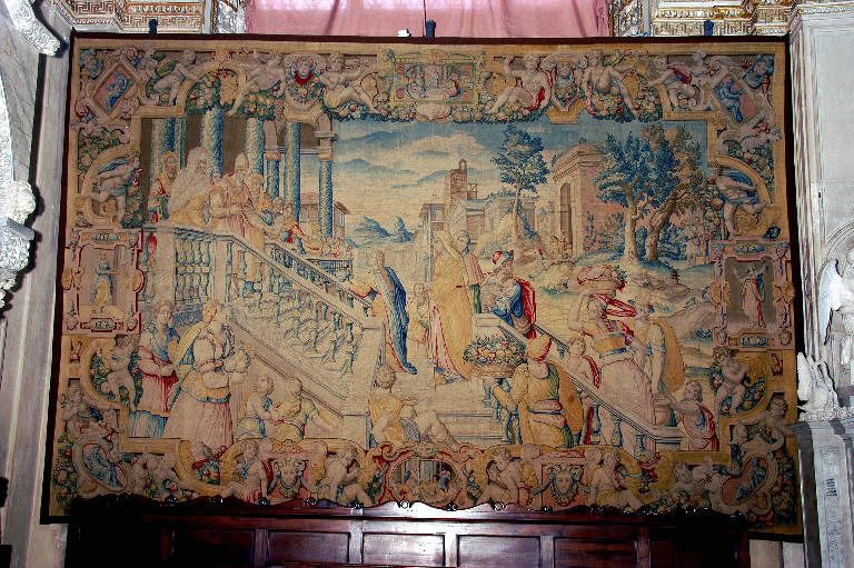 - NOTIZIE STORICO CRITICHE L'arazzo, che raffigura l'episodio della "Presentazione della Vergine al tempio", appartiene alla serie convenzionalmente detta "fiorentina", realizzata nelle Manifatture Medicee, per incarico della MIA, tra il 1583 e il 1586 e interamente dedicata alla vita della Vergine.\nNel 1580 i deputati della Misericordia Maggiore decisero infatti di provvedere la Basilica di arazzi destinati ad ornare l'edificio nelle occasioni solenni, risparmiando così le cifre ingenti che si spendevano per gli apparati effimeri: per il tramite di Girolamo Biffi, uomo d'affari bergamasco d'origine ma da anni residente a Firenze, si presero dunque contatti con il Granduca di Toscana, per ottenere i permessi necessari, e con l'Arazzeria Medicea per l'esecuzione; i cartoni furono affidati ad Alessandro Allori e alla sua bottega, la tessitura a Benedetto Squilli di Michele (Meli, 1962, pp. 24-37). Gli arazzi giunsero a Bergamo in tre consegne successive: nel 1583 la "Natività", l'"Adorazione dei Magi" e la "Fuga in Egitto", tra il 1584 e il 1585 l'"Annunciazione", lo "Sposalizio della Vergine", la "Visitazione", la "Circoncisione" e l'"Assunzione della Vergine"; infine, nel 1586, la "Presentazione della Vergine al tempio" (Meli, cit.). \nL'opera ha subito un complesso intervento di restauro tra il 1997 e il 2001, curato da Annamaria Morassutti (cfr. pratica n. 5883, cart. 95, Archivio Congregazione Misericordia Maggiore, Bergamo).