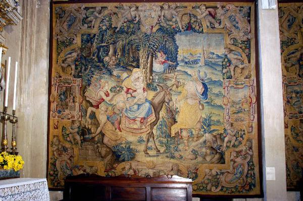 - NOTIZIE STORICO CRITICHE L'arazzo, che raffigura l'episodio della "Fuga in Egitto", appartiene alla serie convenzionalmente detta "fiorentina", realizzata nelle Manifatture Medicee, per incarico della MIA, tra il 1583 e il 1586 e interamente dedicata alla vita della Vergine.\nNel 1580 i deputati della Misericordia Maggiore decisero infatti di provvedere la Basilica di arazzi destinati ad ornare l'edificio nelle occasioni solenni, risparmiando così le cifre ingenti che si spendevano per gli apparati effimeri: per il tramite di Girolamo Biffi, uomo d'affari bergamasco d'origine ma da anni residente a Firenze, si presero dunque contatti con il Granduca di Toscana, per ottenere i permessi necessari, e con l'Arazzeria Medicea per l'esecuzione; i cartoni furono affidati ad Alessandro Allori e alla sua bottega, la tessitura a Benedetto Squilli di Michele (Meli, 1962, pp. 24-37). Gli arazzi giunsero a Bergamo in tre consegne successive: nel 1583 la "Natività", l'"Adorazione dei Magi" e la "Fuga in Egitto", tra il 1584 e il 1585 l'"Annunciazione", lo "Sposalizio della Vergine", la "Visitazione", la "Circoncisione" e l'"Assunzione della Vergine"; infine, nel 1586, la "Presentazione della Vergine al tempio" (Meli, cit.). \nL'opera ha subito un complesso intervento di restauro tra il 2003 e il 2004, curato da Annamaria Morassutti (cfr. pratica 5143, cart. 7/2, Archivio Congregazione Misericordia Maggiore, Bergamo).