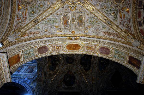 Decorazione del sottarco: fascia ripartita in vari spazi che ospitano cornici a piccoli ovuli di diverse dimensioni, alternativamente ovali, rettangolari e poligonale (al centro) con piccole figure a monocromo viola e bruno; motivi decorativi a girali; in alto al centro, una testina d'angelo.