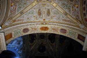 - NOTIZIE STORICO CRITICHE La decorazione di questa parte della chiesa fu realizzata da Francesco e Lorenzo Porta, stuccatori originari di Osteno, sul lago di Lugano, forse tra il 1582 e il 1584, contemporaneamente ai lavori documentati nella navata destra. Nessuna menzione, nei libri contabili della Basilica, dei piccoli affreschi a monocromo, eseguiti probabilmente da un decoratore specializzato attivo nella bottega dei Porta (Cortesi Bosco, in "I pittori bergamaschi...Il Seicento", vol. II, pp. 92-94, nota 5).