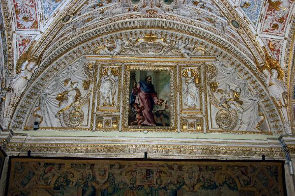Decorazione della lunetta: ai lati, su grandi volute, le eroine dell'Antico Testamento Giaele a sinistra e Giuditta con la testa di Oloferne" a destra; al centro, ricca ancona architravata che ospita, entro nicchie laterali, due figure di Virtù e, al centro, la figura di "San Giovanni Crisostomo" a olio su muro; sulla sommità dell'architrave, due figure di angioletti reggono un cartiglio con iscrizione dipinta.