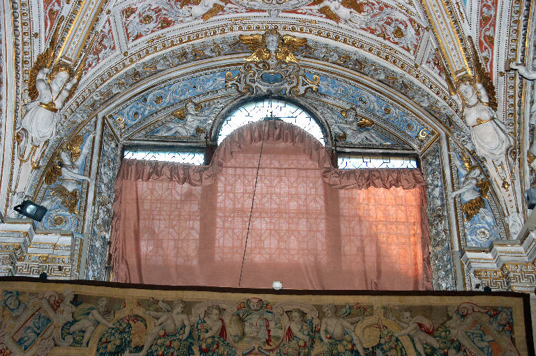 Decorazione della lunetta posta attorno alla finestra: ai lati, due figure d'angelo; fascia decorativa ornata da motivi a girali; in alto, cartiglio sormontato da una testa d'angelo.