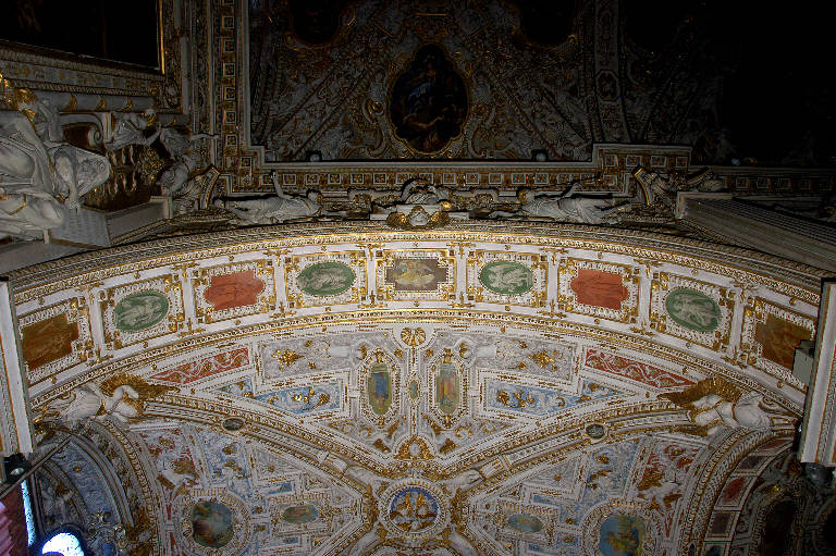 - NOTIZIE STORICO CRITICHE La decorazione di questa parte della chiesa fu realizzata da Francesco e Lorenzo Porta, stuccatori originari di Osteno, sul lago di Lugano, forse tra il 1582 e il 1584, contemporaneamente ai lavori documentati nella navata destra. Nessuna menzione, nei libri contabili della Basilica, dei piccoli affreschi a monocromo, eseguiti probabilmente da un decoratore specializzato attivo nella bottega dei Porta (Cortesi Bosco, in "I pittori bergamaschi...Il Seicento", vol. II, pp. 92-94, nota 5).