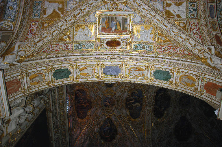 Decorazione del sottarco: fascia ripartita in vari riquadri sagomati che ospitano cornici a piccoli ovuli alternativamente ovali e polilobate, ornate da piccole figure dipinte a monocromo (al centro, immagine di Sibilla seduta con una tavoletta in mano).