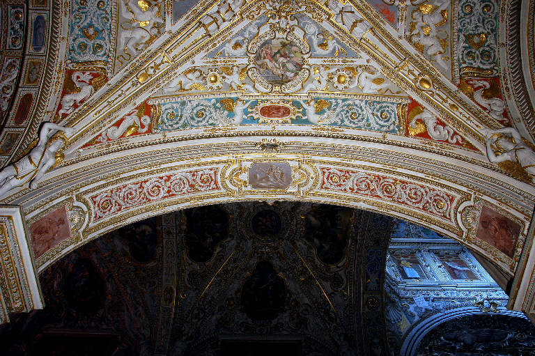Decorazione del sottarco: fascia decorata da un ricco motivo a girali con fiori dorati; al centro e alle estremità, cornici che racchiudono piccole figure dipinte a monocromo (al centro, immagine di Sibilla seduta con una tavoletta in mano e putto a fianco; a destra e a sinistra, figurette maschili, forse di sani)e cornici ai lati sono ornate in alto da un motivo a conchiglia; la cornice centrale reca ai lati due testine d'angelo.