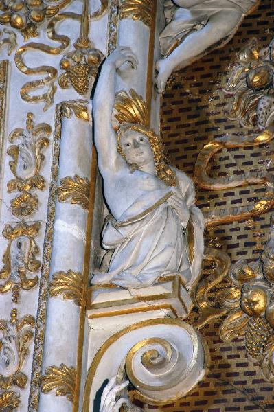 Figura di angelo in funzione di cariatide, con il braccio destro alzato, poggiante su mensola con motivo a voluta.