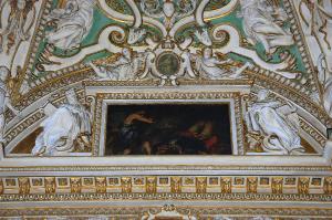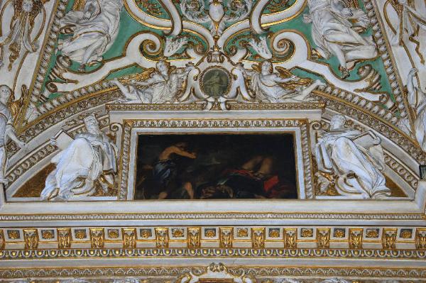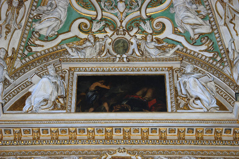 Decorazione della lunetta che racchiude, entro cornice architravata a motivi decorativi vegetali, il dipinto di Luigi Scaramuccia con l'episodio di "Davide e Golia": a destra e a sinistra, due grandi figure di profeti che reggono libri; in alto, sopra la cornice, cartiglio in stucco a volute, retto da due angioletti, posto a cornice di una piccola figura virile con turibolo, dipinta a monocrmo.