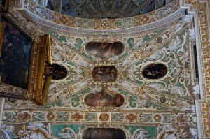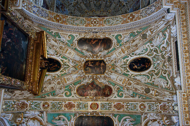 Decorazione della volta della prima campata del transetto: la superficie è divisa in quattro spazi triangolari da fasce ornate da figure d'angeli e cariatidi alternate e disposte a candelabra; al centro, cornice a profilo poligonale; gli spazi triangolari ospitano cornici a delicati profili mistilinei, alternati a profili ovali, ornate di piccole figure di angeli; agli angoli, grandi figure di angeli stanti, in diversi atteggiamenti.