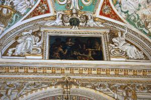 Decorazione della lunetta che racchiude, entro cornice architravata a motivi decorativi vegetali, il dipinto di Ottavio Cocchi con l'episodio biblico di "Rebecca che parte per incontrare Isacco": a destra e a sinistra, due grandi figure di angeli; in alto, sopra la cornice, cartiglio in stucco a volute, retto da due angioletti, posto a cornice di una piccola figura femminile che regge in mano una corona, dipinta a monocormo.
