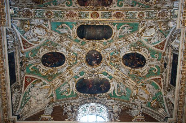 Decorazione della volta della prima campata del transetto: la superficie è divisa in quattro spazi triangolari da fasce ornate da figure d'angeli e cariatidi alternate e disposte a candelabra; al centro, cornice a profilo poligonale; gli spazi triangolari ospitano cornici a delicati profili mistilinei, alternati a profili ovali, ornate di piccole figure di angeli; agli angoli, entro cornici ovali, grandi figure femminili allegoriche, affiancate ciascuna da una coppia di angeli .