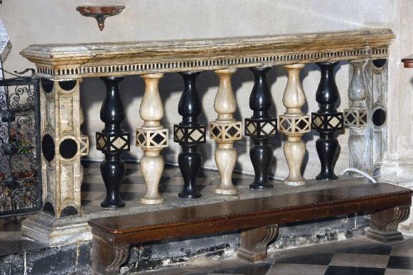 Balaustrata a due bracci: ogni braccio è delimitato ai lati da due pilastrini laterali in marmo grigio venato ornati da un tondo centrale in marmo nero, e da due semicerchi pure in marmo nero; addossati ai pilastrini, due semibalaustrini in marmo bianco, compsti da due elementi raccordati al centro da un dado intarsiato a motivi geometrici in marmo bianco e nero; seguono sette balaustrini, in marmo bianco e nero, alternati, ugualmenti formati da due elementi raccordati al centro da un dado intarsiato; mensola in marmo grigio venato, con fascia inferiore bianca intarsiata a piccoli ovuli in marmo nero.