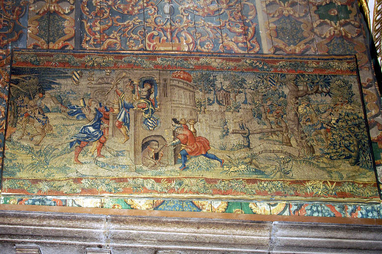 - NOTIZIE STORICO CRITICHE L'arazzo appartiene ad una serie di tre, tutti caratterizzati dalla presenza di uno stemma a bande bianche e azzurre e tutti dedicati al racconto, per riquadri successivi, di un dramma d'amore d'intonazione cavalleresca, ancora non identificato; la serie è convenzionalmente detta "di Daneo", per via della scritta che compare, ben visibile e ripetuta due volte, in questo arazzo; secondo Meli la storia allude forse al mito di Perseo, figlio di Danae, e talvolta chiamato, appunto, Daneo (Meli, 1962, p. 20). \nL'opera, che proviene probabilmente da una manifattura fiamminga attiva nella prima metà del XVI secolo, fu acquistata dai deputati della Misericordia Maggiore tra il 1627 e il 1672: in questi anni, infatti, i libri contabili della MIA registrano diverse annotazioni che riguardano spese per arazzi destinati ad adornare la Basilica di Santa Maria Maggiore; non è facile, però, individuare con precisone i singoli pezzi, per mancanza di elementi (Meli, 1962, pp. 9- 16 e 20-22; Zanchi, 2003, pp. 349-350).