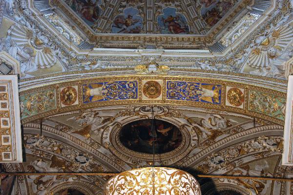 - NOTIZIE STORICO CRITICHE Nessuna menzione, nei libri contabili della Congregazione della Misericordia Maggiore, per la decorazione a stucco dei sottarchi della crociera: Giovan Angelo e Gerolamo Sala lavorano però nella navata centrale della Basilica tra il 1675 (inizio dell'impresa delle volte) e il 1685 (conclusione delle lunette; cfr. Rampinelli, 2001 e Spiriti, 2009), e non è impossibile che la loro attività si sia estesa anche ai sottarchi della crociera; all'interno di questo arco di tempo, gli stuccatori eseguirono forse questa decorazione delicata, che riprende i modelli tardomanieristici di Francesco e Lorenzo Porta, modificandoli con grazia: scompaiono, infatti, i piccoli affreschi a monocromo dei sottarchi delle navate laterali, sostituiti da morbidi rosoni e boccioli di fiore entro quadrati; e sono sottili, quasi evenescenti, i motivi a voluta, cari ai Porta, che partono dalle figure angeliche in forma di cariatidi e dagli eleganti vasi ad anse.
