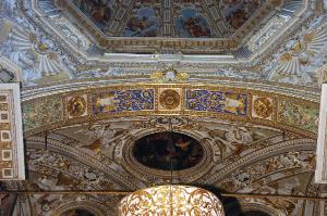 Fascia di sottarco divisa in vari spazi, alternativamente quadrati e rettangolari, da cornici sottilmente dorate: nei riquadri maggiori, vasi ad anse e figure angeliche in forma di cariatide da cui partono motivi a volute; nei riquadri minori, rosoni dorati e boccioli, pure dorati, circondati da girali.
