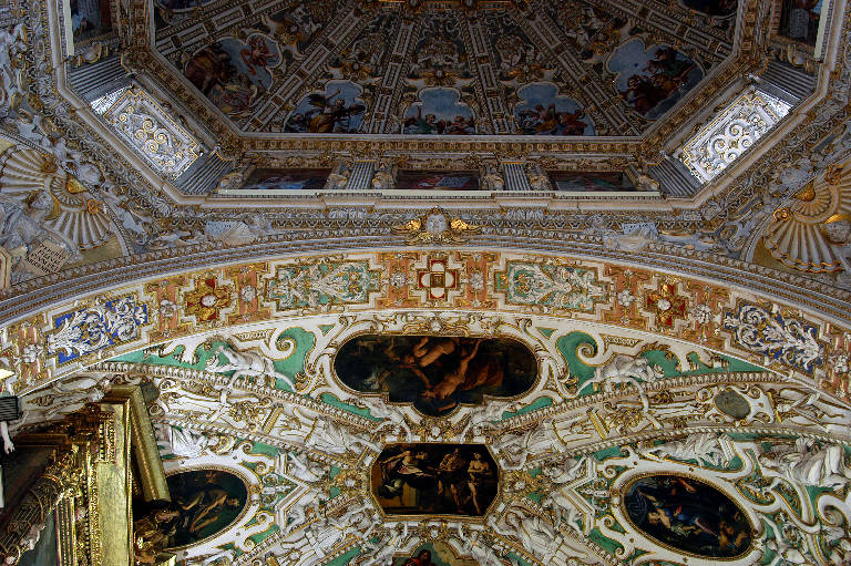 - NOTIZIE STORICO CRITICHE Nessuna menzione, nei libri contabili della Congregazione della Misericordia Maggiore, per la decorazione a stucco dei sottarchi della crociera: Giovan Angelo e Gerolamo Sala lavorano però nella navata centrale della Basilica tra il 1675 (inizio dell'impresa delle volte) e il 1685 (conclusione delle lunette; cfr. Rampinelli, 2001 e Spiriti, 2009), e non è impossibile che la loro attività si sia estesa anche ai sottarchi della crociera; all'interno di questo arco di tempo, gli stuccatori eseguirono forse questa decorazione delicata, che riprende i modelli tardomanieristici di Francesco e Lorenzo Porta, modificandoli con grazia.