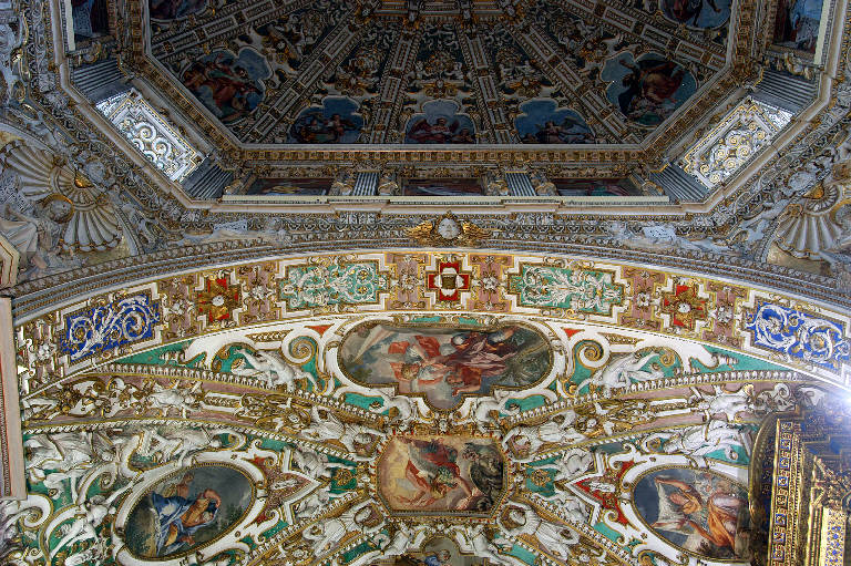 - NOTIZIE STORICO CRITICHE Nessuna menzione, nei libri contabili della Congregazione della Misericordia Maggiore, per la decorazione a stucco dei sottarchi della crociera: Giovan Angelo e Gerolamo Sala lavorano però nella navata centrale della Basilica tra il 1675 (inizio dell'impresa delle volte) e il 1685 (conclusione delle lunette; cfr. Rampinelli, 2001 e Spiriti, 2009), e non è impossibile che la loro attività si sia estesa anche ai sottarchi della crociera; all'interno di questo arco di tempo, gli stuccatori eseguirono forse questa decorazione delicata, che riprende i modelli tardomanieristici di Francesco e Lorenzo Porta, modificandoli con grazia.