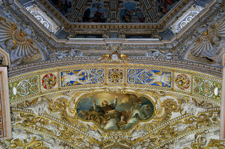 Fascia di sottarco divisa in vari spazi, alternativamente quadrati e rettangolari, da cornici sottilmente dorate: nei riquadri maggiori, vasi ad anse e figure angeliche in forma di cariatide da cui partono motivi a volute; nei riquadri minori, rosoni dorati e boccioli, pure dorati, circondati da girali.