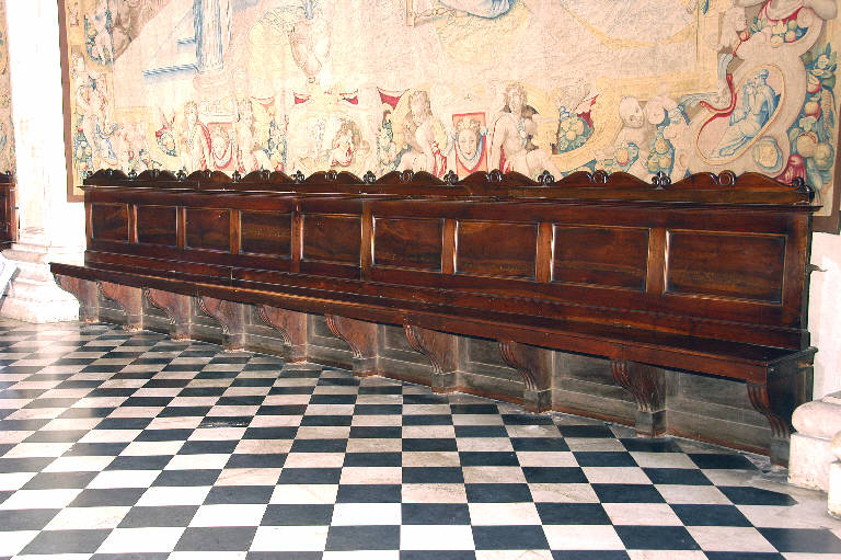Serie di otto panche con schienale in legno di noce, di varie lunghezze, ma di identico modello, con sedile sostenuto da mensole scanalate e schienale a riquadri modanati, coronato da elementi intagliati a voluta.