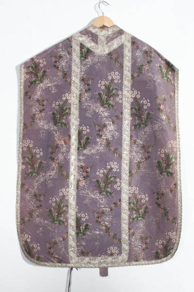 Paramento liturgico in taffetas broccato. Su di un fondo viola un motivo decorativo della tipologia a "meandro" è tracciato dal sinuoso svolgersi in verticale di un nastro argenteo cui si attorciglia una ramificazione con bacche. Nelle anse sono collocati mazzi di piccoli fiorellini bianchi che alternano la direzione. Ornani i pezzi del parato galloni in argento filato e argento laminato eseguiti a telaio.