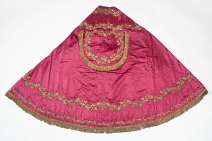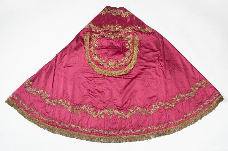 - NOTIZIE STORICO CRITICHE Il piviale in esame fa parte di un paramento liturgico. I motivi a ricamo, eseguiti in oro filato, oro laminato e canutiglia oro con applicazione di paillettes dorate su un supporto in raso di seta rosso, sostituiscono visivamente l'applicazione del gallone. Il disegno, che presenta lo svolgersi sinuoso di racemi vegetali e campanule, non è altro che una rielaborazione in chiave classicista di modelli più antichi. Il carattere minuto e schematico del motivo vegetale, che si limita a sottolineare la struttura stessa del piviale, è ben lontano dalla vivezza e dal naturalismo plastico dei modelli settecenteschi e indica una realizzazione nella prima metà del secolo successivo.