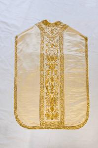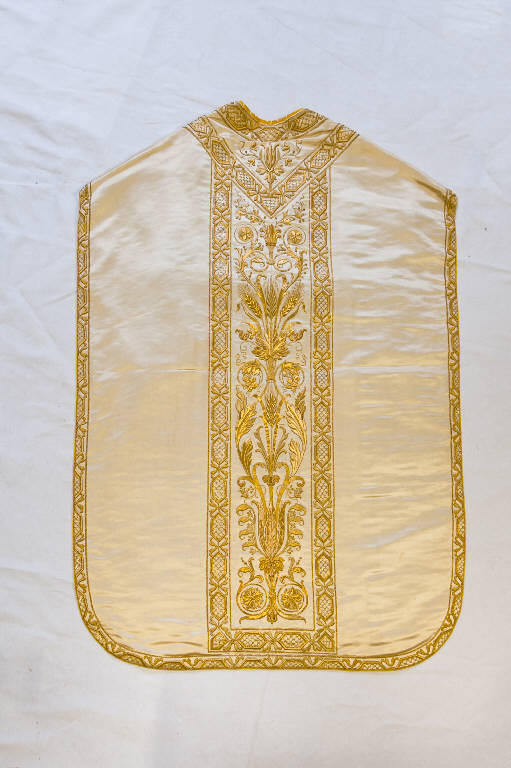 Paramento liturgico in raso bianco. Il disegno, eseguito a ricamo in oro filato, oro laminato e oro riccio con applicazione di paillettes dorate, si snoda dal basso verso l'alto con coppie di tralci affrontati che allargandosi e ricongiugendosi danno origine a foglie d'acanto, girali terminanti in corolle fiorite, volute e mazzi di spighe di grano. I bordi sono rifiniti da fregi geometrici dorati caratterizzati da maglie esagonali congiunte da piccoli nastri che visivamente sostituiscono l'applicazione del gallone.