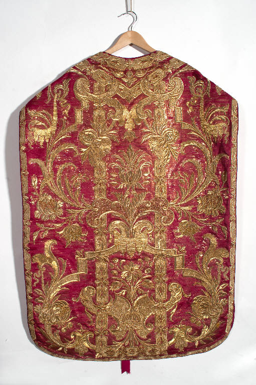 Paramento liturgico in raso rosso. Il ricchissimo ricamo, eseguito in oro filato, oro laminato e canutiglia oro, si sviluppa in tralci d'acanto con peonie, margherite, mensole e motivi mistilinei.