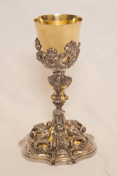 Calice in argento con base mistilinea a più gradini partita da sinuose ed aggettanti volute in tre faccie a fondo dorato ornate da teste di cherubino. Il fusto è risolto in un nodo piriforme centrale arricchito da valve di conchiglia, volute arricciate e racemi vegetali con collarino e nodo di raccordo argentati. Il sottocoppa, eseguito a traforo, è costituito da cartelle, volute, foglie d'acanto e teste di cherubino.