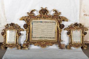 Servizio di cartagloria (una centrale e due laterali) in metallo argentato e dorato. Piedini a gradini. Cornice mistilinea delimitata da volute fitomorfe decorata con gigli, foglie d'acanto e tre teste di cherubino realizzate a fusione poste ai lati della cartella e al centro del fastigio; cornice della cartella ornata da una teoria di ovoli.