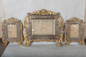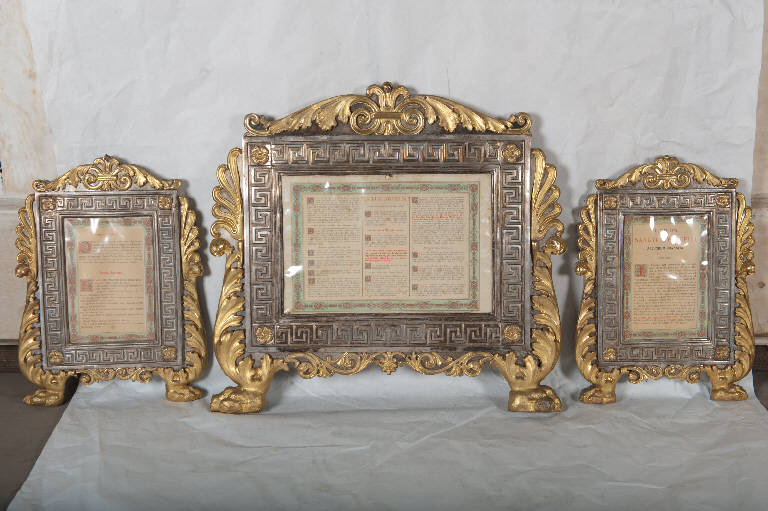 Servizio di cartagloria (una centrale e due laterali) in metallo argentato e dorato. Piedini a zampa di leone. Cornice mistilinea con racemi vegetali terminanti in fiori, foglie d'acanto e volute; cornice rettangolare della cartella decorata con greca a meandro e fiori a quattro petali agli angoli.
